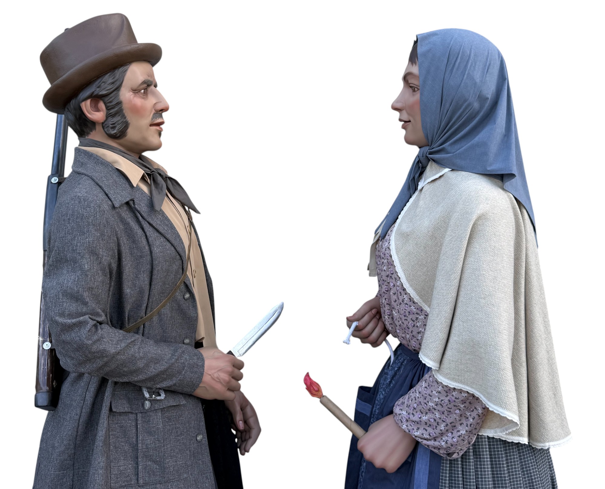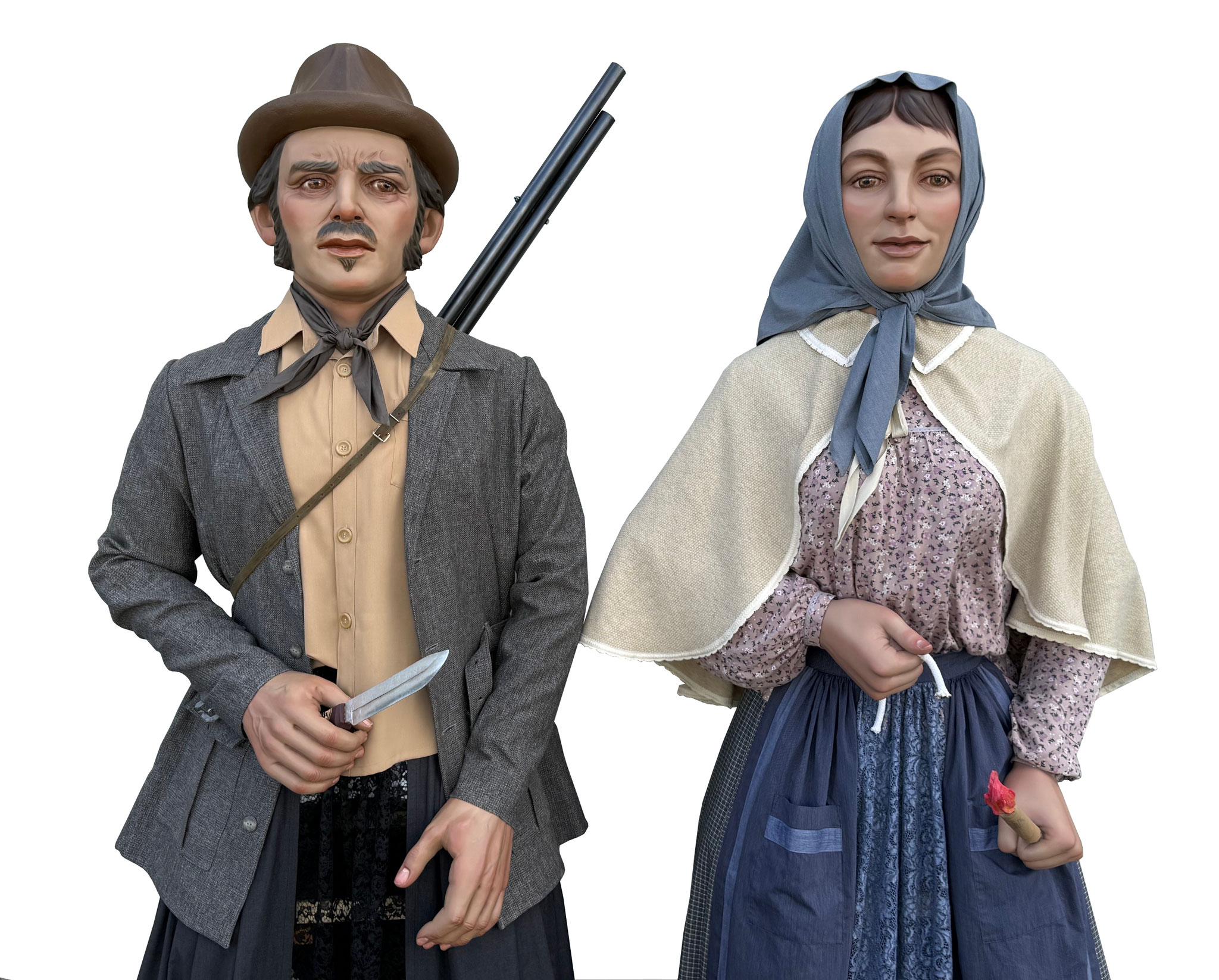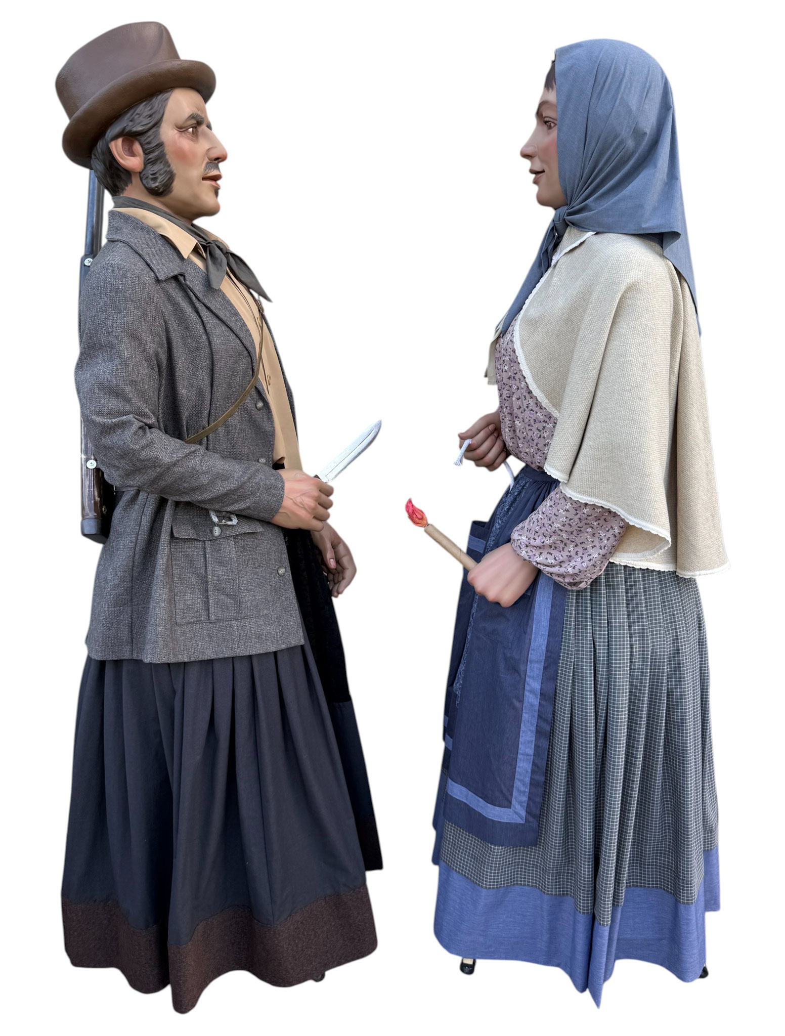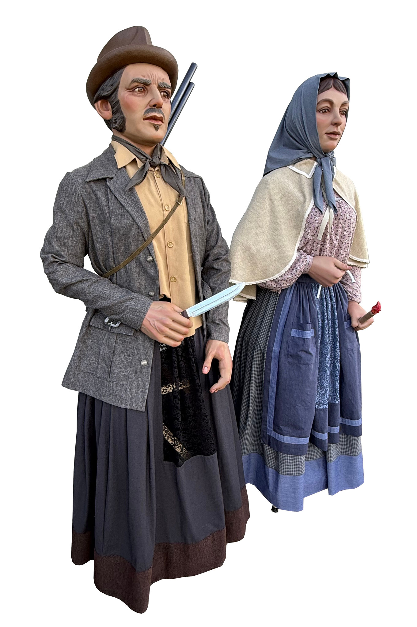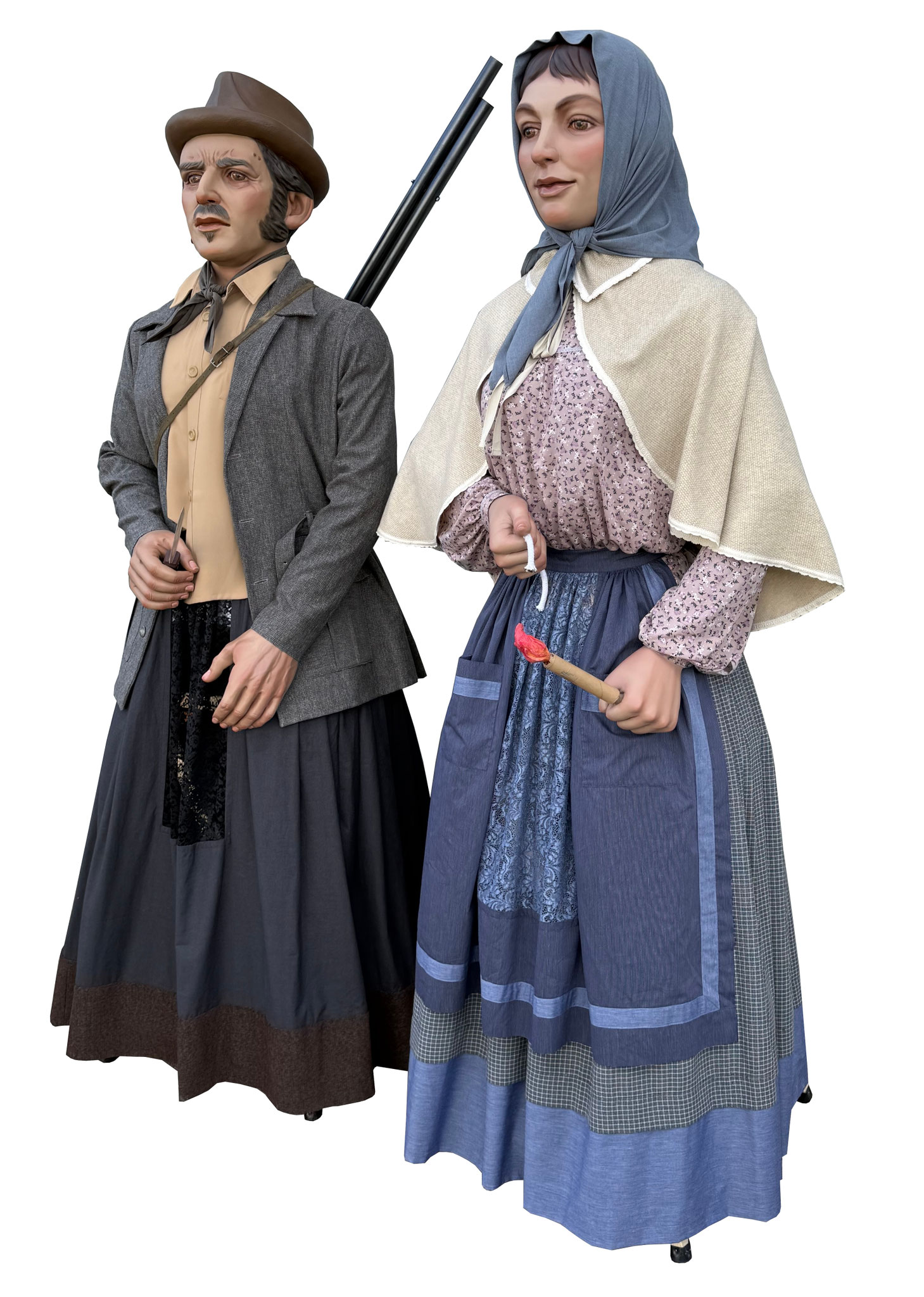 Pareja de gigantes de tamaño cadete para el barrio pamplonés de Buztintxuri. Representan a una pareja formada por personajes populares como un cazador y una guardesa, buscando el vínculo con la historia y con el pasado de las tierras en las que hoy está situado el barrio.