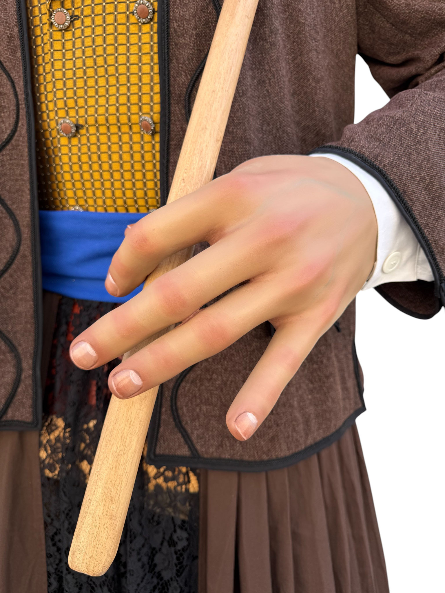Manuel es un personaje de leyendas locales de Zalla y poco se sabe de él. Recoge sus historias Antonio de Trueba en su libro "Capítulos de un libro. Sentidos y pensados, viajando por las Provincias Vascongadas". Según la información, esta persona nace en el primer tercio del siglo XVIII, en el seno de una familia labradora, de ahí que lleve un laya al hombro. Debido a la época, viste un traje de calzón y montera, como los que se ve en el conocido como "Traje arratiano" o "Traje vizcaíno" y en el grabado "Aldeano de Vizcaya" de este siglo. Componen el traje la montera de color marrón, una camisa blanca sencilla, un chaleco adamascado abotonado, y sujetando el calzón marrón, un gerriko de color azul. Lleva también una chaqueta del mismo color que el calzón, decorada con cordón negro.